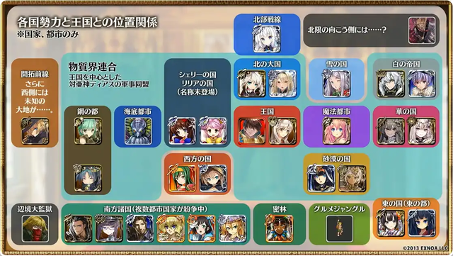 多分王国と北の国と帝国が一つの大陸にあって砂漠の国が別の大陸で東の国は王国の大陸の東にある島国で南方諸国は王国の大陸をユーラシアとしたときの東南アジアってイメージ